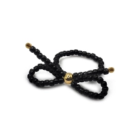 Pierścionek z malutkimi czarnymi koralikami ułożonymi w formę kokardki, osadzony na elastycznej gumce. Delikatność wzoru kokardki nadaje pierścieniowi lekkości i dziewczęcego uroku. Dzięki zastosowaniu gumki, jest to praktyczny i wygodny dodatek, który świetnie dopasowuje się do rozmiaru palca. Pierścionek jest nie tylko słodkim akcentem w codziennych stylizacjach, ale także sprawdzi się jako subtelny element wieczorowych zestawów, dodając im uroku i oryginalności.